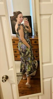 This is the 2nd time I’ve rented the small and the 2nd time I wish I’d rented the XS. I am 15 weeks pregnant so kept thinking I’d need the small, but it does run big and XS would have fit a little better in the sleeves and length. It’s a beautiful print, comfy, cozy dress that can be dressed up or down depending on the occasion. I’ll still wear it, but the sleeves/shoulders do flop down/over frequently!