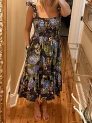 This Cara Cara New York dress features a vibrant floral print with romantic puff sleeves and a tiered skirt, giving off a whimsical summer vibe. Accentuate its square neckline with delicate jewelry and pair with strappy sandals for a charming ensemble.