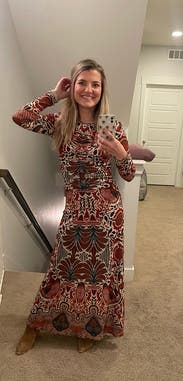 I wore this dress to Mother’s Day brunch! It was lightweight and had a great shape while still being modest for hanging out with the family. I loved the colors and pattern of the dress. It’s loud without being overwhelming. A great boho option for a day on the town.