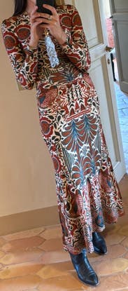 This dress was a 10/10 for me! It is a stretchy crepe that looks great straight out of the suitcase. It also packs up so small compared to other formal-ish dresses I’ve traveled with. The fabric has a little weight to it so it was warm and forgiving, but it was still light enough that I was comfortable walking around in the high 70s. The ruching down the front makes it very flattering. The pattern is gorgeous- I got so many compliments. I am pretty short, and it just skimmed my ankles. I was able to wear it with flats (we were walking from our hotel to dinner and the opera), but I had to pick up the skirt to go up stairs comfortably. Im usually between XS and S. I am glad I went with a small - it kept me comfortable but if you want something more form fitting, Id go down/TTS. I plan to rent this again for a fall destination wedding. It can definitely be dressed up or down depending on the occasion. Perfect dress no notes!