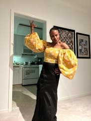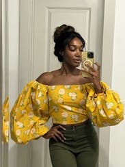 Cannot get enough of these sleeves! The color, the pattern, the puff! Obsessed. However, super hard to eat while wearing this beauty! My husband and I couldn't stop laughing at my moves to avoid dunking my sleeve in my curry. Still. Loved it so much that I bought it! No regrets!