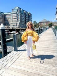 I was worried the sleeves would look clownish, but they are super stylish and fun! Wore it wine tasting. There is a stretch to the bodice and it is cropped. Great with high waisted pants.