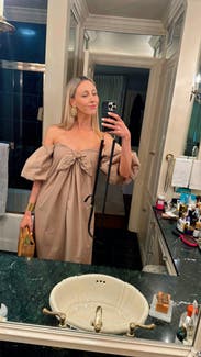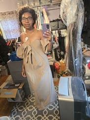 This dress is stylistically outside of my normal comfort zone, and I'm so glad I went there. It's stunning in person. The sleeves and the draping at the chest are so pretty. The body of the dress is loose in such a flattering way -- it doesn't look too too baggy, but it's so forgiving. Great for eating a big ole dinner. Honestly it's giving paper bag but make it fashun. The corset top was great - I didn't need a bra (I do have a small chest tho ftr), and the length was ideal for me but I am pretty tall and wore heels. I recommend pairing this with colorful accessories to spice it up. I would rent again and/or buy this dress.