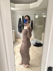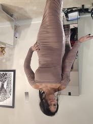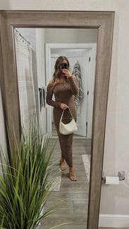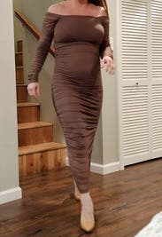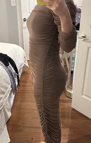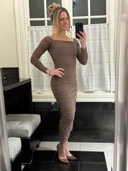 I love this taupe dress. Great fit. Covers all the things I want it to cover while still being sexy. Will be perfect for a wedding in Paris!