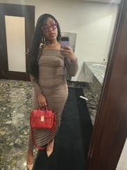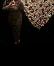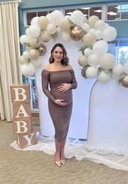 I wanted to step up the baby shower dress game while being warm and comfortable. This stunning dress fit the ticket! I received an extraordinary number of compliments from both friends and strangers. I’m 33 weeks pregnant, and currently weigh 160 lbs (30 lbs more than my pre-pregnancy size 4 frame). The medium stretched well whilst holding everything in place. The only issue I had was where the upper arms connected to the bodice of the dress. It was a bit tight. I’d definitely rent this dress again when postpartum. So flattering!