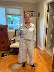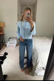 Surprised me! I think the color and floral detail takes a boxy cut that can sometimes look a bit too shapeless and gave it some femininity. The shirt is cropped, wore with high waisted jeans. Fabric is heavier which I enjoy as it keeps shape well.