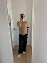 I paired this lightweight Cece sweater for work with the Donni Rib Kick Flared pants (which I wore several times on subscription and then bought). I love the all-natural fiber of the knit, perfectly comfortable in August. It has a light sheen and although you can’t see the wide vertical rib of the front in the photo, it ensures that the sweater fits smoothly all the way down without fussing to adjust. It’s definitely cuter on the model but I liked it a lot and will choose it again.