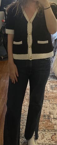 I liked this sweater open vs buttoned (like other reviews, the buttons kind of flared out, didn’t look flattering). First TTS, cute little poof in the sleeves on the shoulders.
