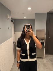 This CeCe cardigan offers a classic preppy look with its contrasting black and white color scheme and gold button details. Pair it with high-waisted denim for a timeless and polished ensemble.