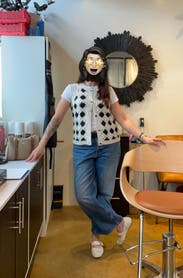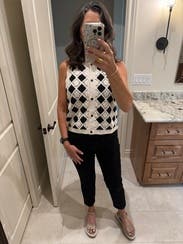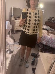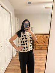 Cute sweater vest that is trending right now. I thought it would be too long on my petite torso but not at all. I do wish the top was a bit more fitted but I am 32A so not going to happen. Cute, I'd rent again