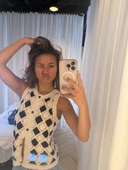 Was pleased that you couldn’t really see my bra through the crochet holes. I rented a size M but maybe I should have rented the S so that it was more fitted. I wish it was just slightly less long.