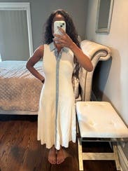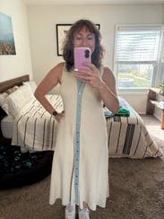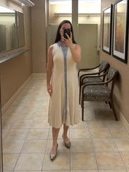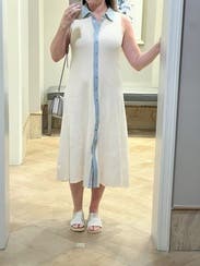 Loved the full length button detail on this dress. The material was soft and comfortable but heavier than I expected. I think the weight caused it to sit funny on my hips but noticeably. I was able to easily dress it up or dress it down with different shoes. A very easy dress to throw on and feel put together.