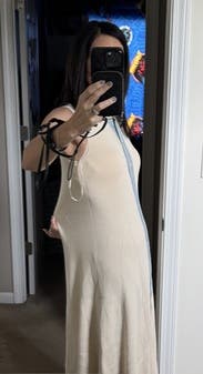 this dress is very cute! just a bit too big—would’ve sized down, but definitely could have been stretched sweater material.