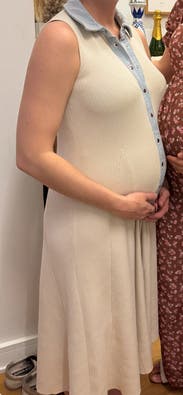 Absolutely loved this one! The ribbed knit material was soft and very flattering, with just the right amount of stretch to accommodate a growing bump comfortably. The denim collar detail gave it a unique, polished touch, making it easy to dress up or down. I got lots of compliments and felt confident in it. Great option for pregnancy.