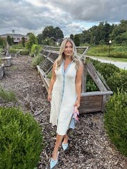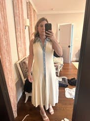 This preppy dress by Cece is so easy to wear! In my opinion, it runs true to size with a lot of stretch. I recommend renting your normal size. This style feels roomy throughout the midsection and hips, but still gives a structured look. It would work for all cup sizes, and you are able to wear a standard bra with this dress. I did criss-cross my straps just in case the sleeveless look cut in too far, but probably would have been fine either way. At 5’10”, the length was just right for a midi. The denim collar and accents were a perfect touch! Pair it with a sandal or sneaker for walking around town! I wore it all day in DC while we were visiting museums, and it transitioned perfectly to rooftop drinks afterward.