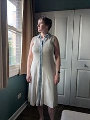Got to cut the tags off this new dress. Love the heavier knit and thicker ribbing, especially when indoors in the summer and businesses crank down the A/C to an uncomfortable temperature. The denim box plate and collar are a fun detail.
