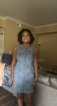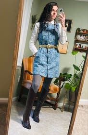 Denim material with a cool rose print on it. Was quite boxy on me so I belted it. Didn’t absolutely love but got away with wearing it to work for the day.