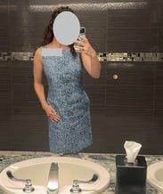 This is better than the photo. I really like the weight of the fabric, structured but not heavy and fitted without being too tight to form, flattering. Can be dressed up or down. Has pockets. Is a work appropriate length for someone 5 ft 5. It can read a bit fancy as is jacquard but can also read cool, like printed denim. I can see wearing this in the fall with a tight black turtle neck under and boots. I may have to buy this little number! Came new with tags. The boat neck is really pretty and the buttons make it look luxe. Plenty of room in the bust, to not pucker, I’m not filling it out at 34B in the medium, works well but has room. Rent!