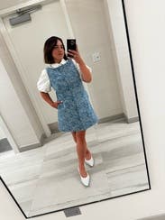 Such a cute dress, and I like that it can be dressed up or down. I wore it to lunch at an outdoor restaurant with flat sandals, and then with white sneaks for just running errands. Both looked good. As far as sizing, if you're torn on which size to order, I'd suggest choosing the larger one. I stayed with the XS but I think the S would have given me just a little more room.