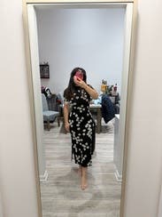 Black floral (60% Polyester, 40% Viscose). Casual Dresses. Mock Neck. Short Sleeve. Pull On. Shoulder To Hemline Length: 48". Slit Length: 11.25". Imported.
