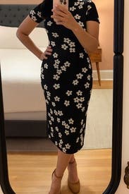 This sophisticated CeCe Flower Jacquard Knit Dress is a modern midi silhouette featuring a bold floral pattern and subtle texture from its jacquard knit fabrication. Pair this flowing designer dress with sleek black pumps and simple stud earrings for a refined, balanced look.
