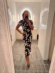 This dress fits perfectly and is so comfy. The slit doesn’t come up too high so it was totally appropriate for work. I wore with tights and heeled black boots.