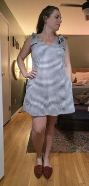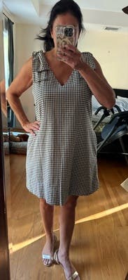 I only wore this once for a date night because I didnt think the bows on the shoulder were my vibe, but the dress slides on so nice, the pockets are always a perk, and its effortlessly flattering. I can fit in mediums, and large, but tried the XL and it was still tight in the bust, not too noticeable though. I would size up.