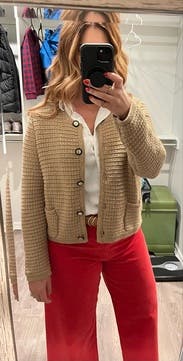 Lots of gold happening and then sparkles too - but comfy and nice structure if that’s the look you’re going for. The buttons sag if you chose to wear it open.