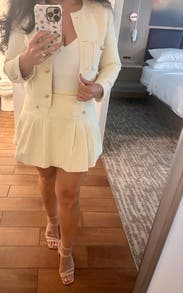 Rented this skirt with the matching jacket. The color is a great way to brighten up a corporate wardrobe in spring/summer. I only gave it 3 stars, because it is short on my 5’3 frame and felt inappropriate to wear in a conservative work setting. The pleats helped make it feel a little more acceptable to wear, despite the length. I wore it on a day that I was just in the office, but I would never wear it to a client meeting. If you aren’t wearing it in a conservative setting, the whole set is beautiful! The waist is very TTS, so if your stomach is a problem area, or if you are in between sizes, I’d recommend sizing up 1 size.