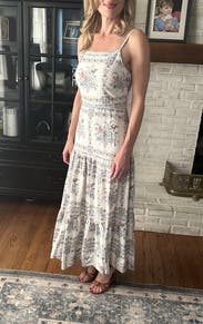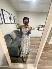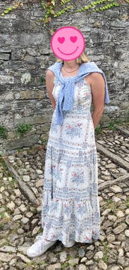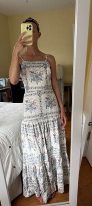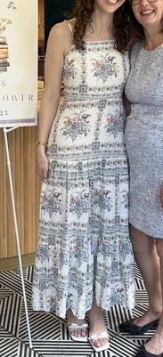 I love this dress! So happy I rented and really want to keep it. It’s heavier fabric so perfect for slightly warm days in Spring or a cool summer night, but a hard no in August. I paired it with 2 1/2” heeled sandals and it was a perfect length for my 5’4” frame. It was fitting in the waist but for the bust it worked. The straps are adjustable and gave me the perfect fit and I paired it with a denim jacket that compliments the look.