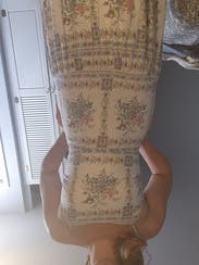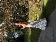 I have just tried it on but I rented this for a trip to the Caribbean. The fabric is a linen blend and has a lovely vintage look to it. Fits perfectly, not wearing a bra. The bottom half isn’t lined and slightly sheer because of the light color. I’m 5’2” and I’m wearing a 3” heel in the photo. She’s long and gorgeous, and I can’t wait to wear her!