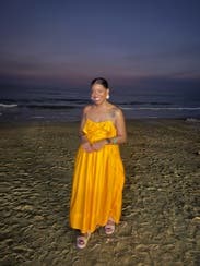 this is in my top 5 rentals from RTR. the color is stunning on black women. the shape, the cute pockets, the thin straps...i mean i love everything about this maxi dress. i wore it to dinner on vacation with white sandals and had all eyes on me. i love the way it flows, the way it shines. it does wrinkle easily, but i tried to iron out as much as possible. i would buy if i could today. Definitely a keeper and repeat fit.