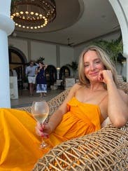 I sized up on this because the last CB dress I rented was soooo tight in the chest. This one was good! But you could completely see my entire backside through the opening at the back of the dress. I embraced it and wore shorts underneath. The color is very kraft mac n cheese lol but it worked for a Palm Springs trip!