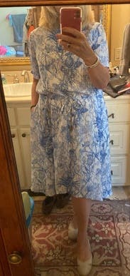 The drawstring around the waist helps add some shape to this breezy, flowy dress. The hem goes up a bit in the center front. It was comfortable to wear and it has pockets (!). I wore it out for dinner at a fancy restaurant and felt appropriately dressed. I paired it with a Veronica Beard Farley Dickey jacket. This would be comfortable for all day long, doesn't bind anywhere while making me feel dressed up.