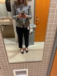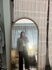 This one looked better on me buttoned up. It was definitely a fall/winter blazer and was a touch warm for me. Looked super cute standing up and for my big meeting. I didn’t love it on zoom though…