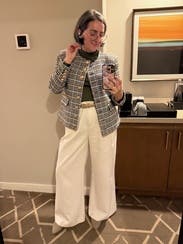 This blazer is lovely! The colors look fantastic with black slacks and would probably go nicely with cream slacks too. The gold buttons give it an elevated, expensive look. It is wool, so don’t plan to wear this in the middle of summer. However, for a freezing cold office in Florida (like mine), or a fall/winter day somewhere else, it is perfect! Came new with tags. When I first put it on, the arms/shoulders felt a little tight/stiff. I was worried I wouldn’t be able to bend my arms, or move much, all day after struggling to button the jacket up. Thankfully, it just needed a little breaking in, so if you’re concerned when you first put it on, give it some time! Other than that, fit is TTS. Fitted and flattering, not boxy and laughably humongous like some of the blazers these days. Could easily leave it unbuttoned and dress it down with nice jeans for a put together, casual look as well. Will definitely rent again.