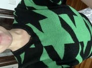 I loved this. It has some black wire detail around the edges of the neck and wrists. I loved the green color and the star print. Very cute. Light enough to wear as a layer but warm enough to wear as the final layer.