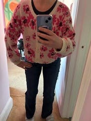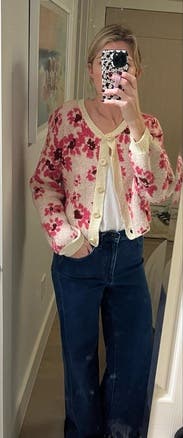I like the print and the idea of this sweater but it ran a little big boxy and cropped. Wore it buttoned and open. Slightly itchy.