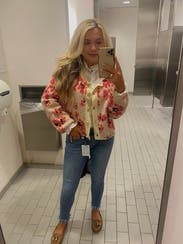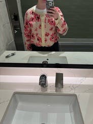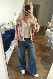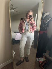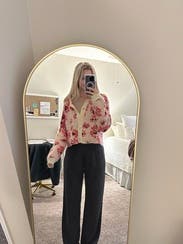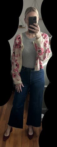 Really loved print and material. Felt a little stretched out and didn’t work unbuttoned (too floppy with heavy buttons). Cropped but not too cropped for me (petite).