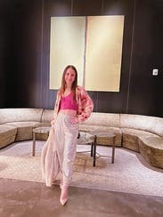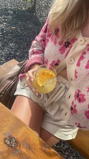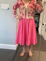 This pink sweater paired perfectly with a pink skirt I rented and was a great outfit to wear. Tons of compliments. The sweater is not hot but is chunky. It fits oversized.