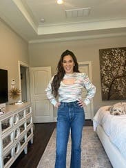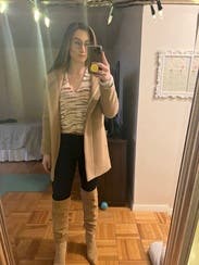 Loved this sweater! Could style it so many ways and just looks so cute with regular jeans or a fun colored pant! Wore this for a parents weekend brunch and would def rent again.