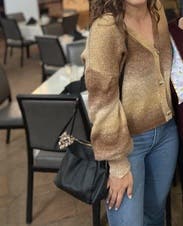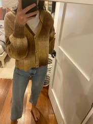 Very high quality and fun sweater! The balloon sleeves gave it a very slouchy, effortless vibe and the color was perfect for fall. The only thing I would note is that the buttons look opal-y on the model, but are definitely a more neutral brown in person.