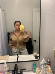 Super cute cardigan that was oversized for a nice relaxed look. Next time I rent, I will definitely size down because the sleeves were too long for my short arms.
