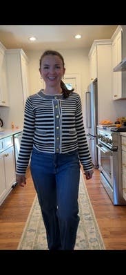 I wanted to love this — soft knit, polished without being stuffy — but I didn’t end up wearing because it wasn’t quite right. The neckline was wider than I usually like, though maybe could have worked with a button down underneath. The front pockets add bulk to the belly area. I went with my larger size here, but think these would have been issues with the larger size too.