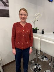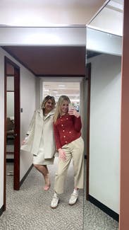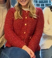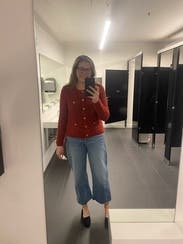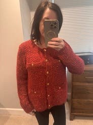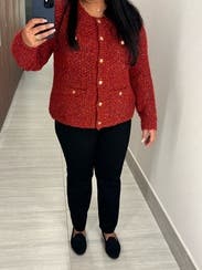 I wore this cardigan fully buttoned up over a black denim skirt for Thanksgiving, and it was perfect for the occasion! The red is just right for fall, and the fabric isn't itchy or uncomfortable but still warm. Dressed it down over jeans for lunch and over slacks for work. Would rent again!