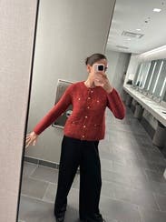 I looooved this cardigan. The detail on the buttons were so cute. The cardigan was thick and warm. Perfect for holiday parties or work events!