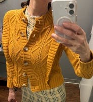 This cable knit sweater is just perfect. It is cropped so very trendy and fashionable. Very warm. Wear it unbuttoned or buttoned up. I have broad shoulders and this was a perfect size.