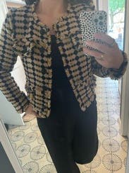 I got tons of compliments on this jacket. I wore for work and found that it fit well. I ordered a 0 and it fit comfortably, though the length was shorter than I expected in the back so I needed to wear higher rise pants with it. Perfect for work. The inner layer is silk which I liked.