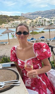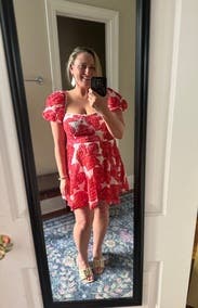 A bright whimsical, and fun summer dress with gorgeous details. Loved the lace trim, embroidered flowers, and volume in the sleeves & skirt. I wore this for a backyard 4th of July Party & it was a hit. 9/10 (knocked a point off because it’s a littleeee short)