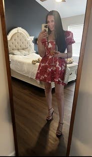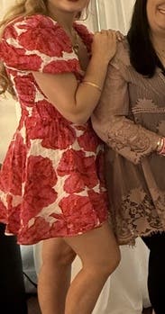 I don’t know if this is shrunk or what. Maybe a medium would have been better? The chest sat on top of my boobs. Like what is going on here with the cup fit… I have a 34C and if I tried to bring the wire cups of the dress under the bottom of my boobs, it looked more of a disaster than it does in this photo which is hard to imagine. I don’t shy away from short dresses, but this felt like it had been shrunk. As pretty as this dress is, Totally unhappy with this one unfortunately.